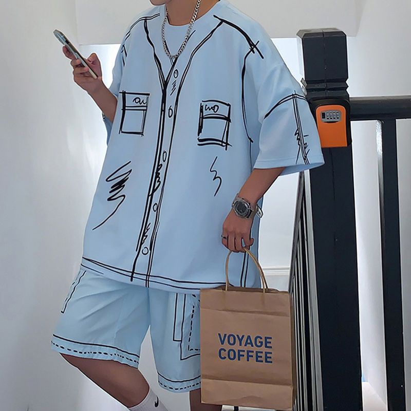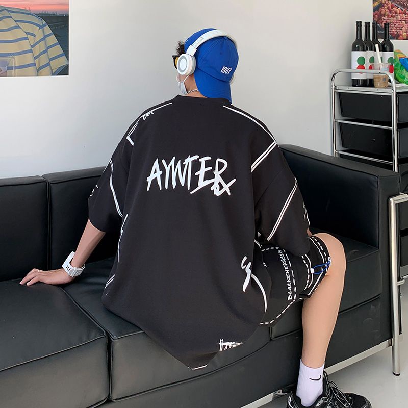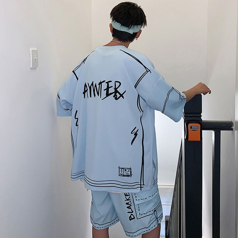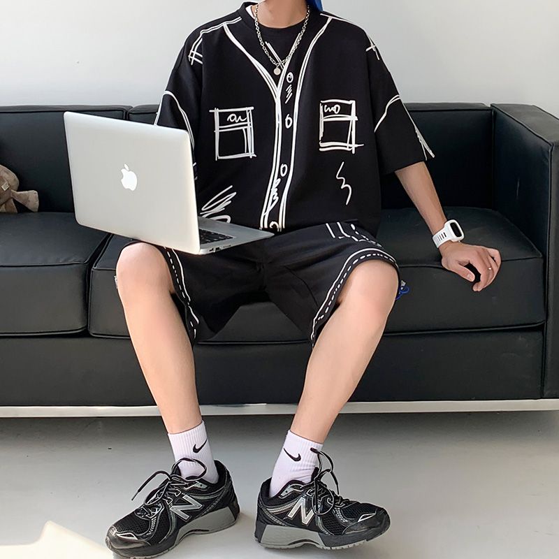 【X-MEN】150kg Graffiti sports suit men's plus size cargo ice silk short-sleeved two-piece set